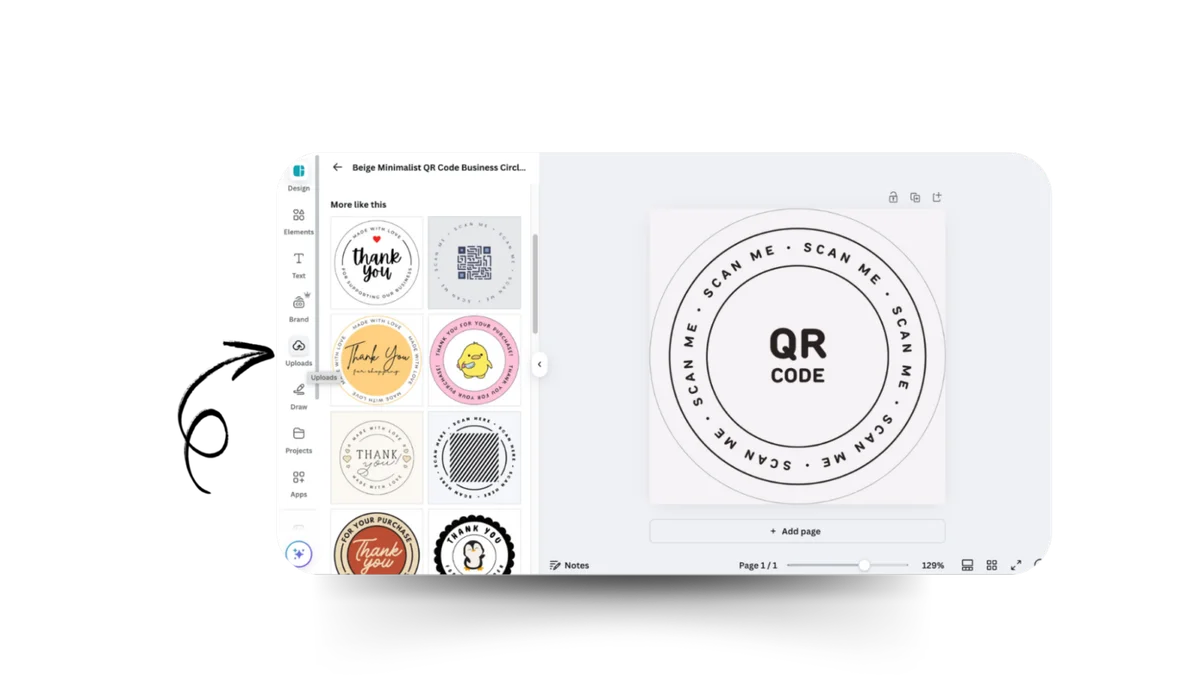 - The next step is to add your QR code to the sticker. Click on the upload option from the left bar at the 5th number. Upload the QR code from your device. Then click on it to add the code to your sticker.